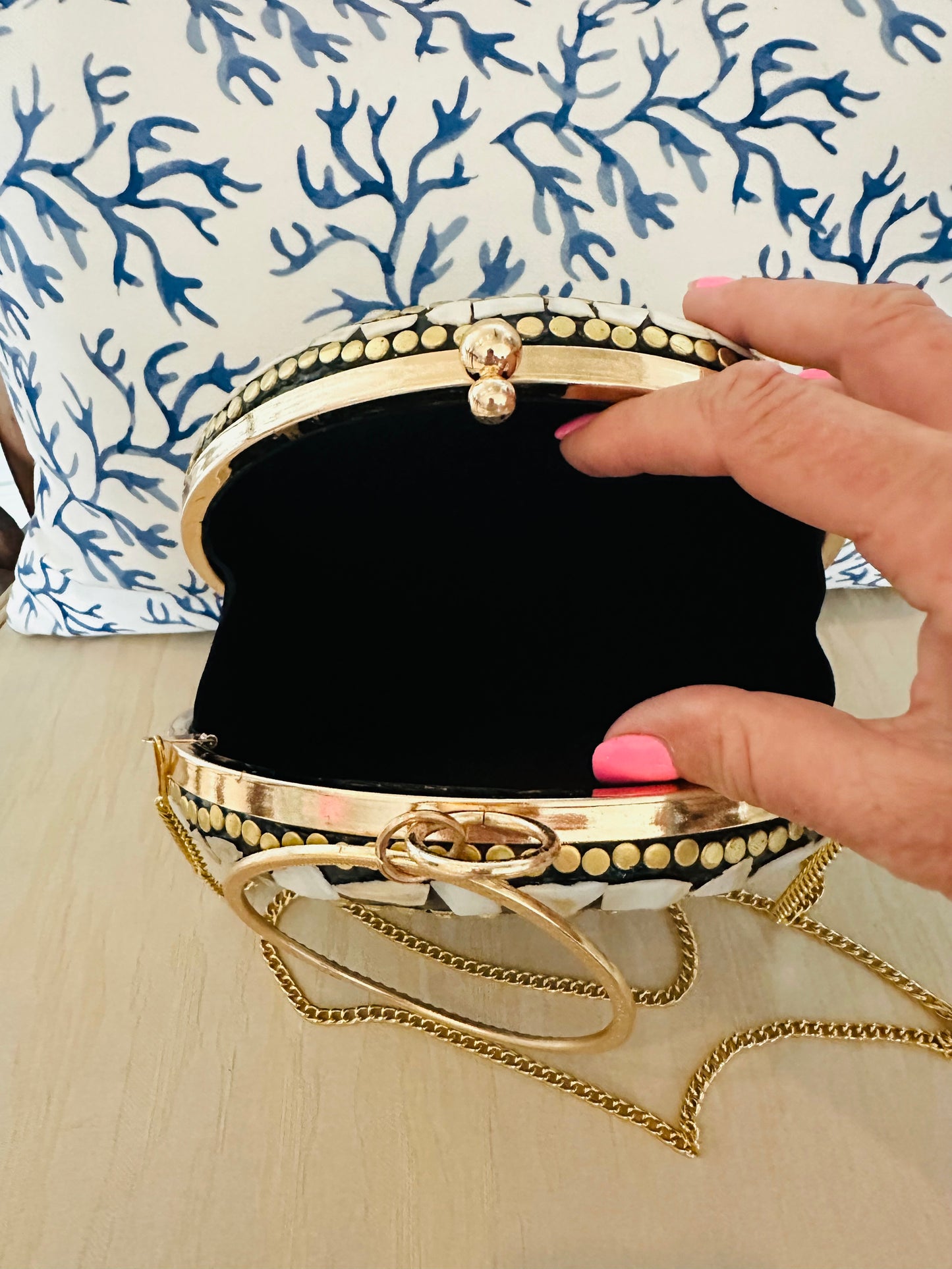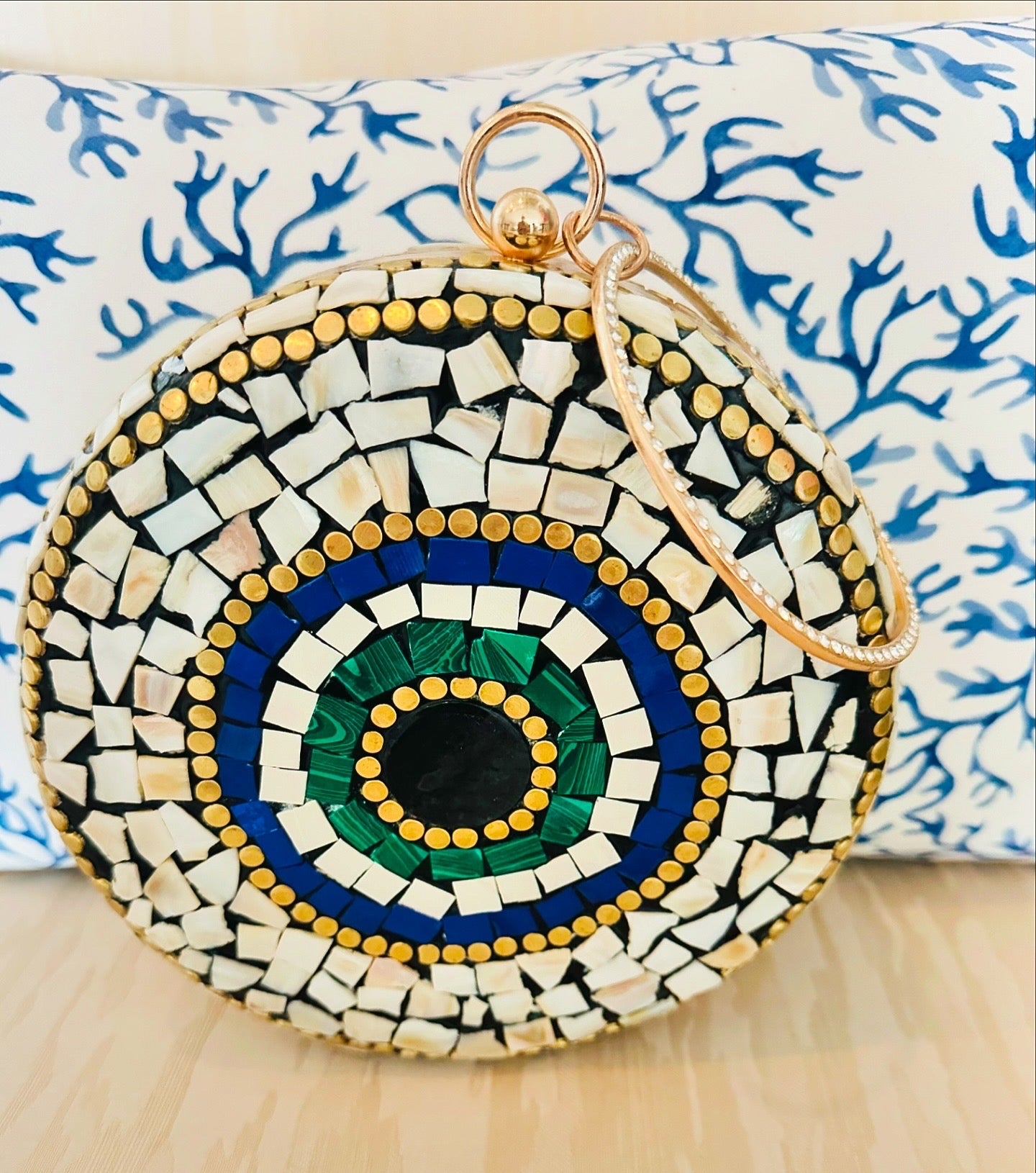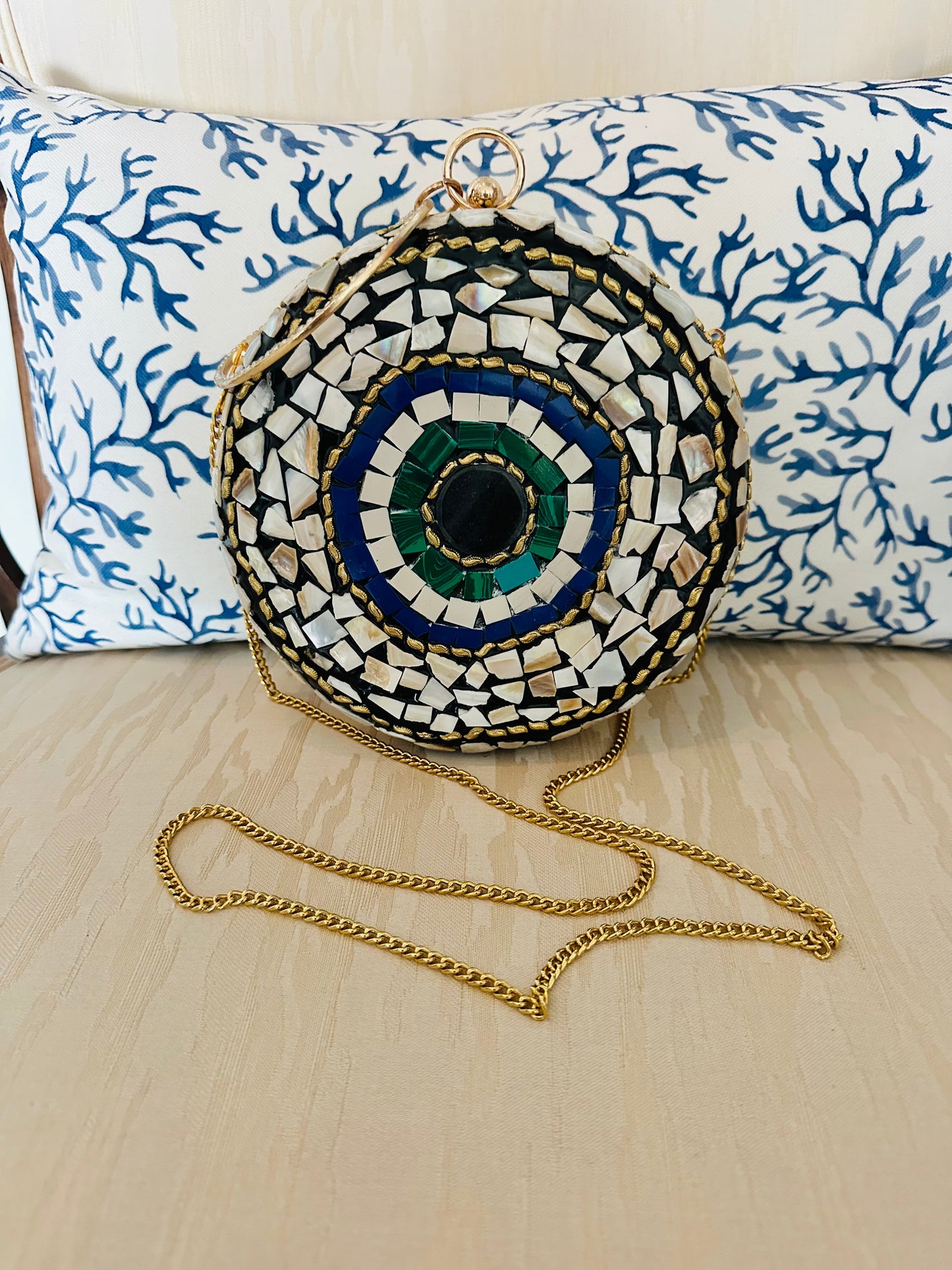 Handcrafted round mosaic evil eye clutch comes with detachable change also can be held using the round pave ring. Each piece is uniquely crafted so variations will occur.