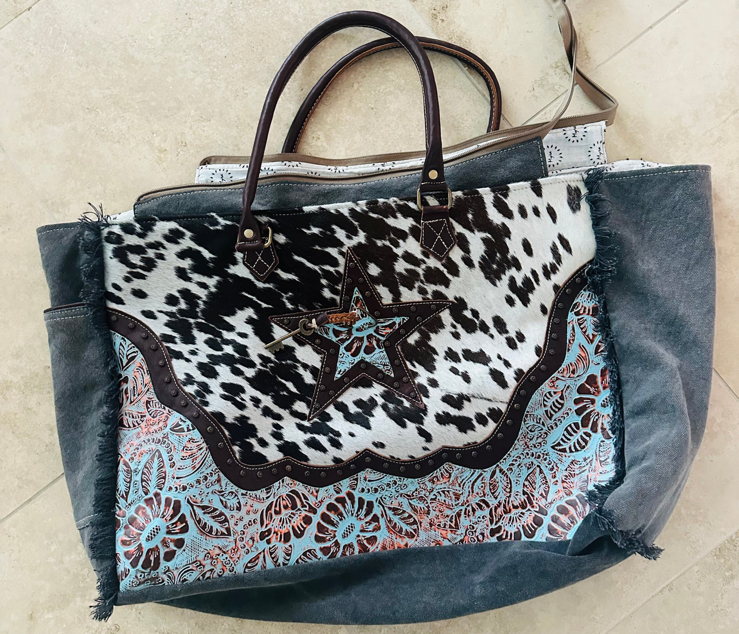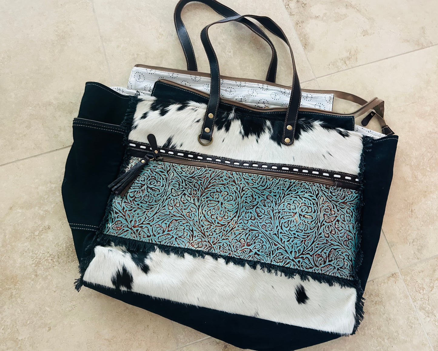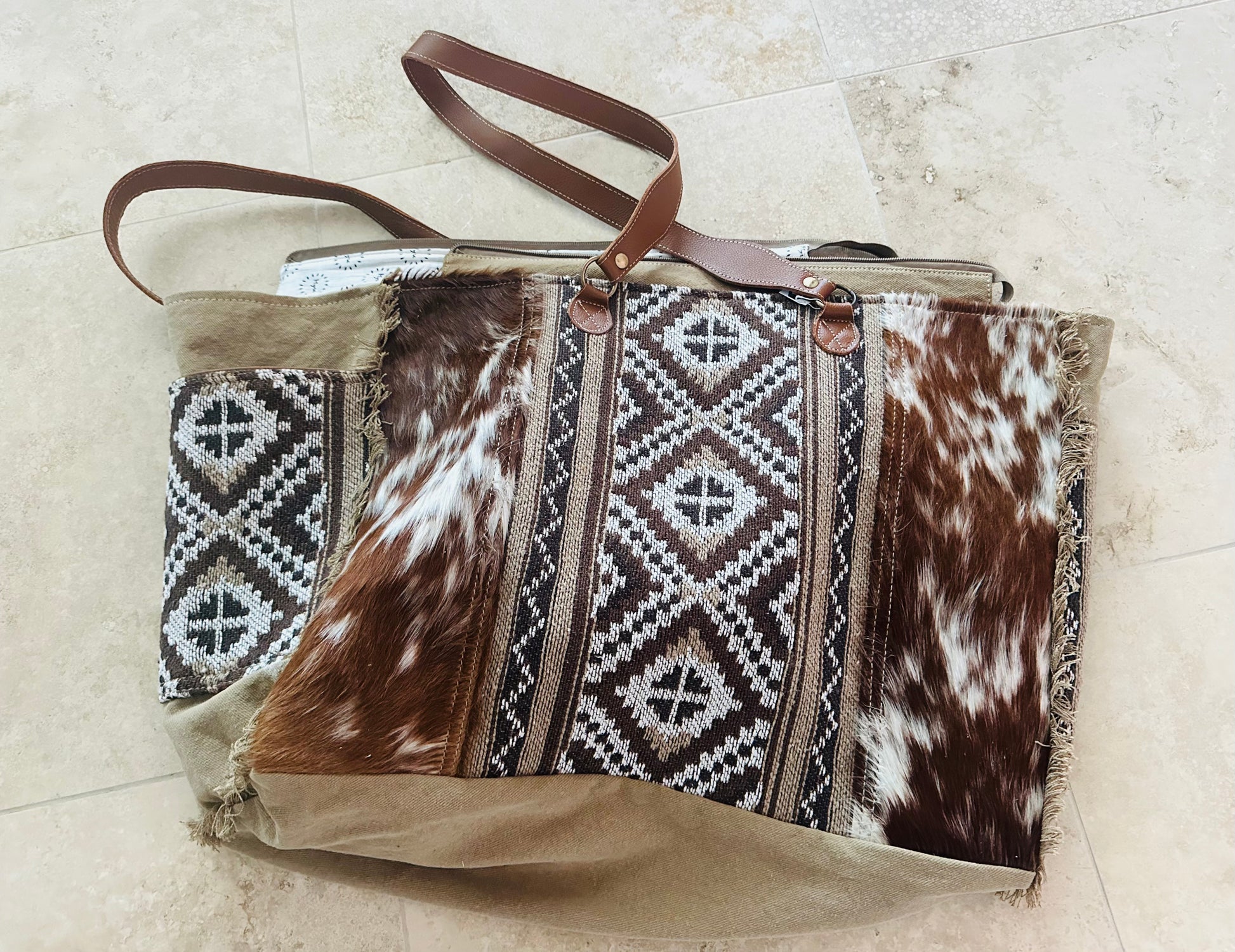 Large Tote/Weekender Bag with natural cow hair and leather. Side pockets, back pocket, inside pockets. Holds a lot!