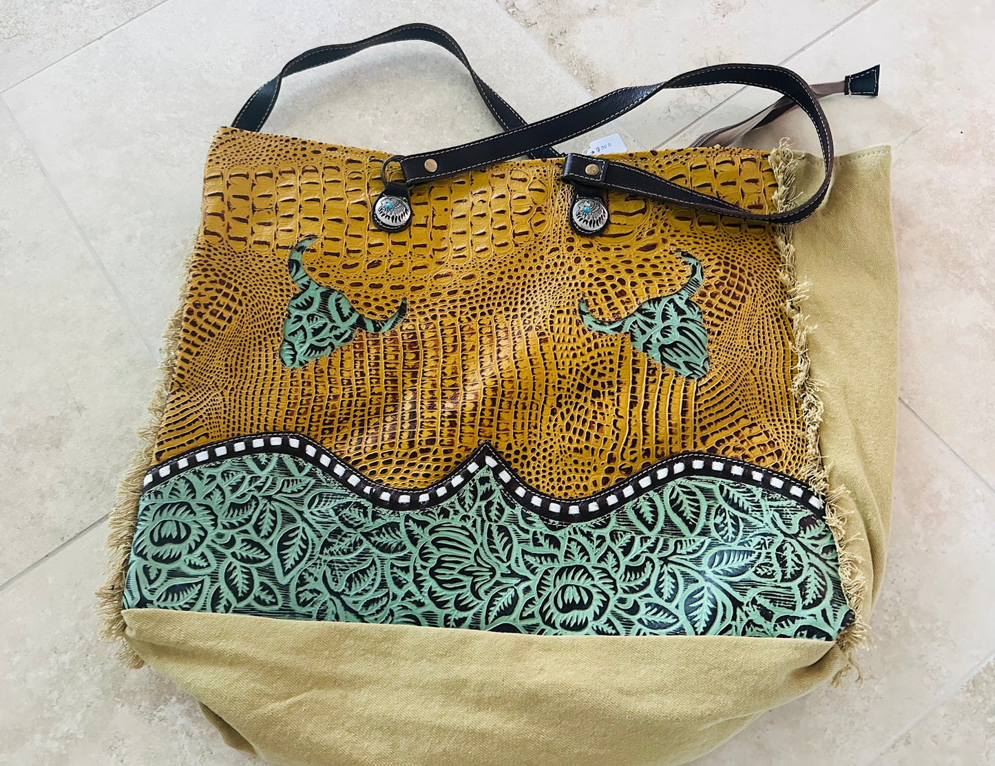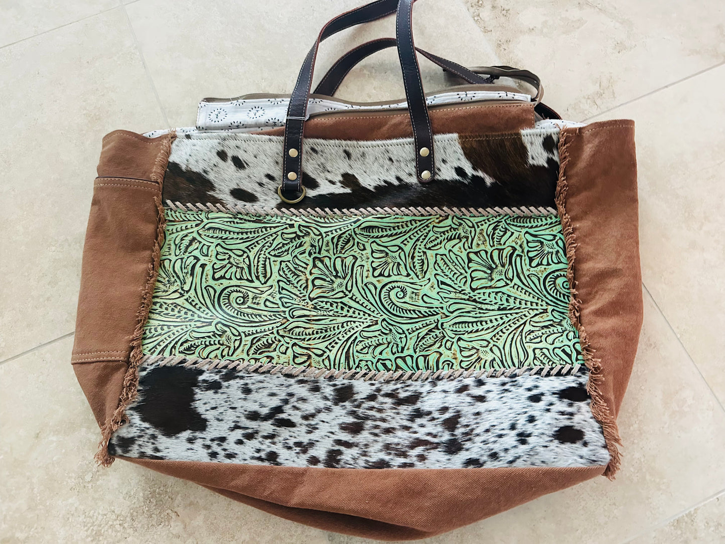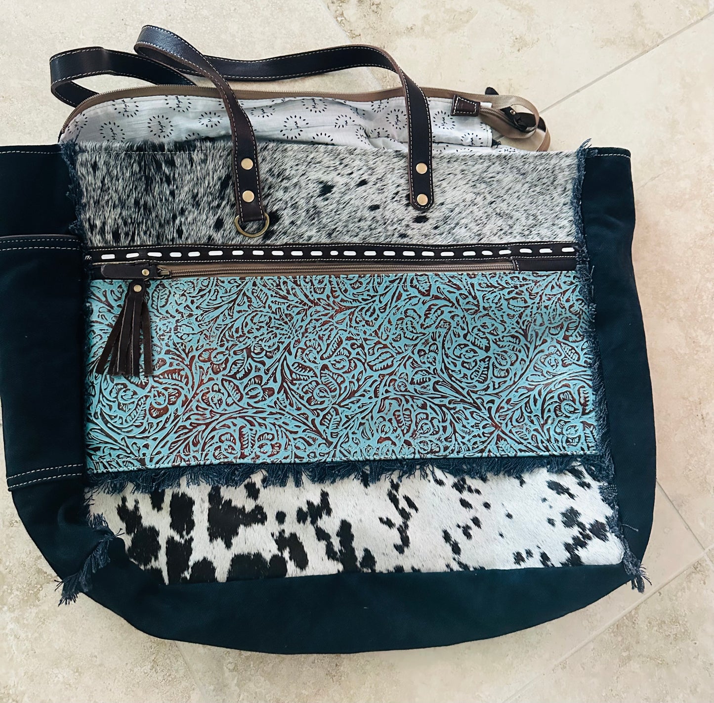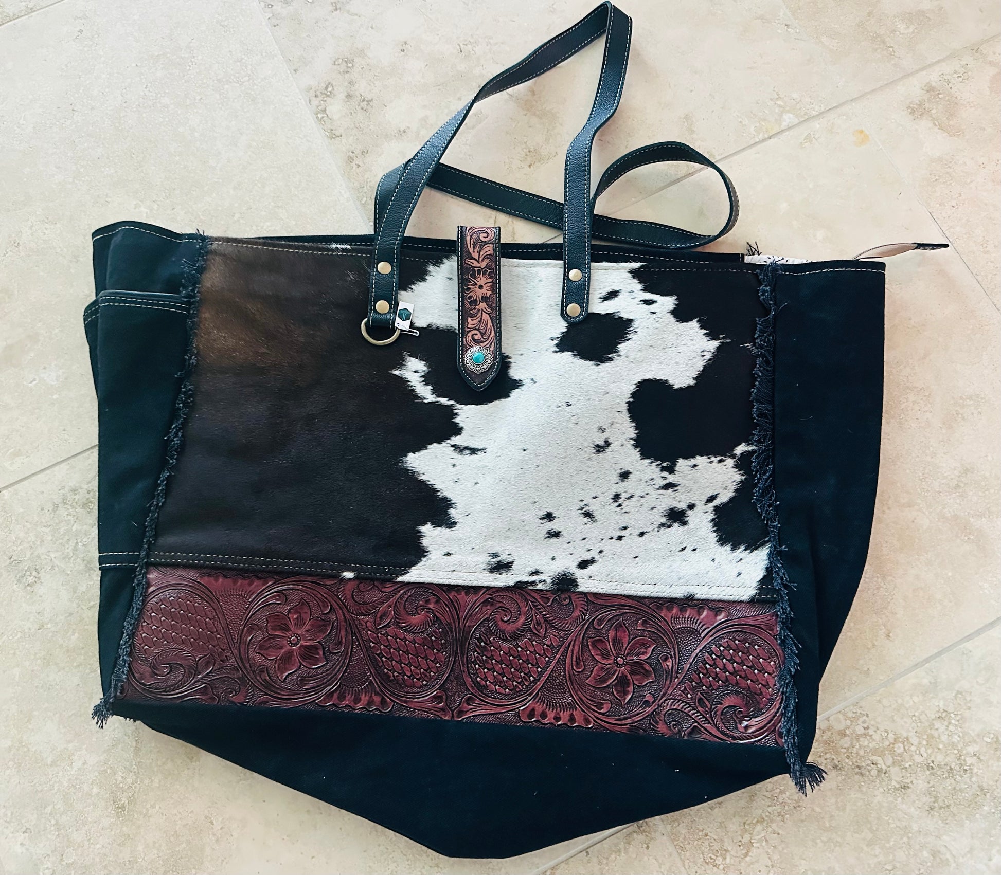 Large Tote/Weekender Bag with natural cow hair and leather. Side pockets, back pocket, inside pockets. Holds a lot!